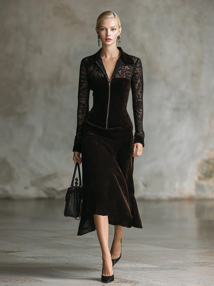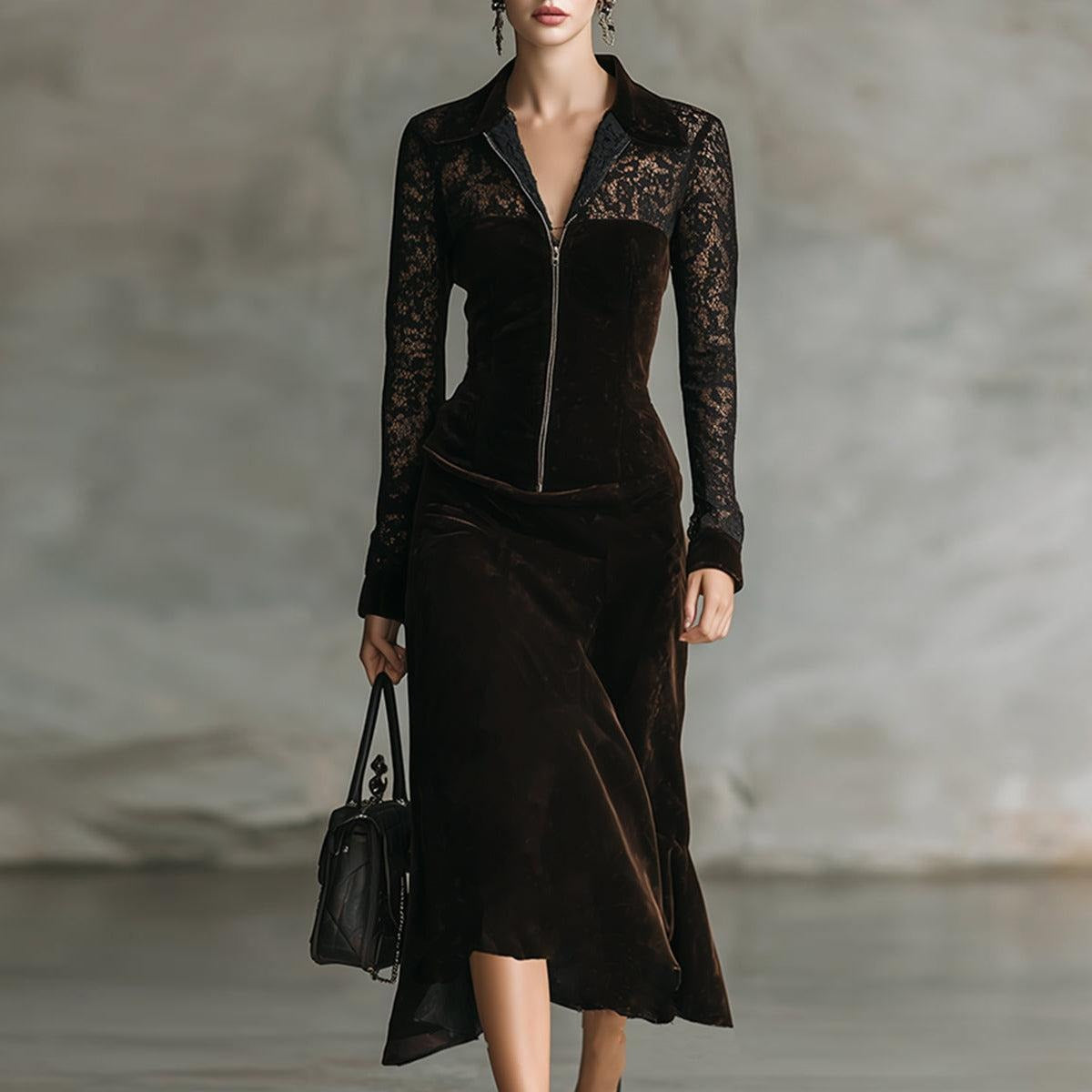 - Features: Collared neckline, front zip closure, lace long sleeves, fitted waist, asymmetric midi skirt