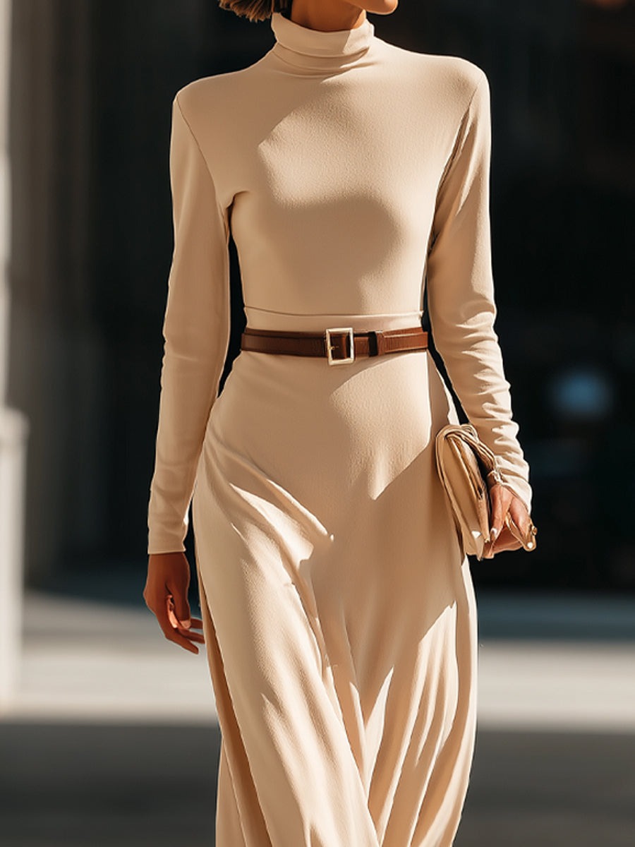 WOOLX presents a fluid and sophisticated maxi dress designed for the woman who moves with quiet confidence. This beige high-neck silhouette features long sleeves and a slim belt that cinches the waist, creating a balanced harmony between modesty and allure. With its clean lines and flowing skirt, the dress embodies understated elegance perfect for both professional and refined social settings.