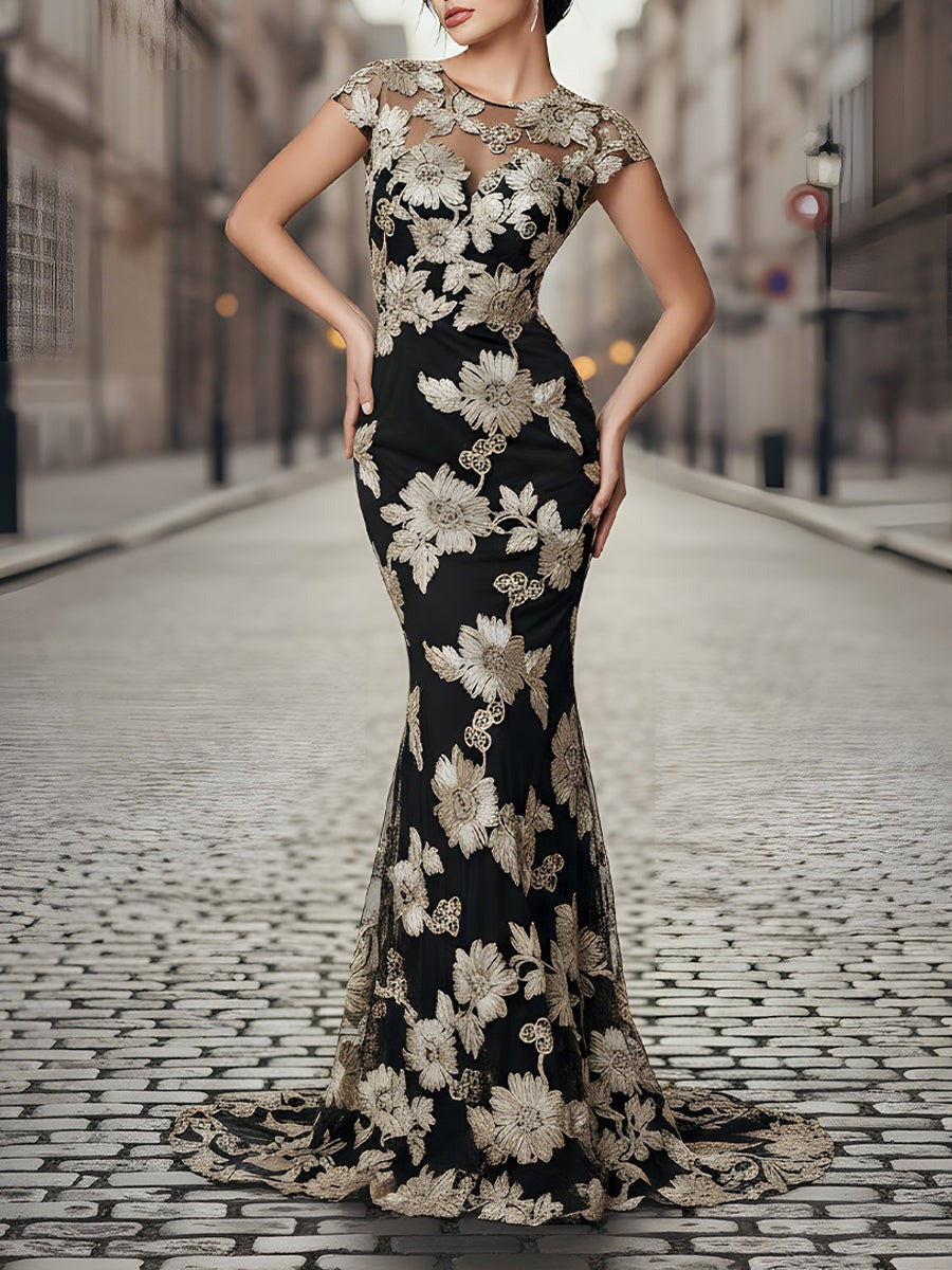 Black And Gold Floral Embroidered Mermaid Evening Gown