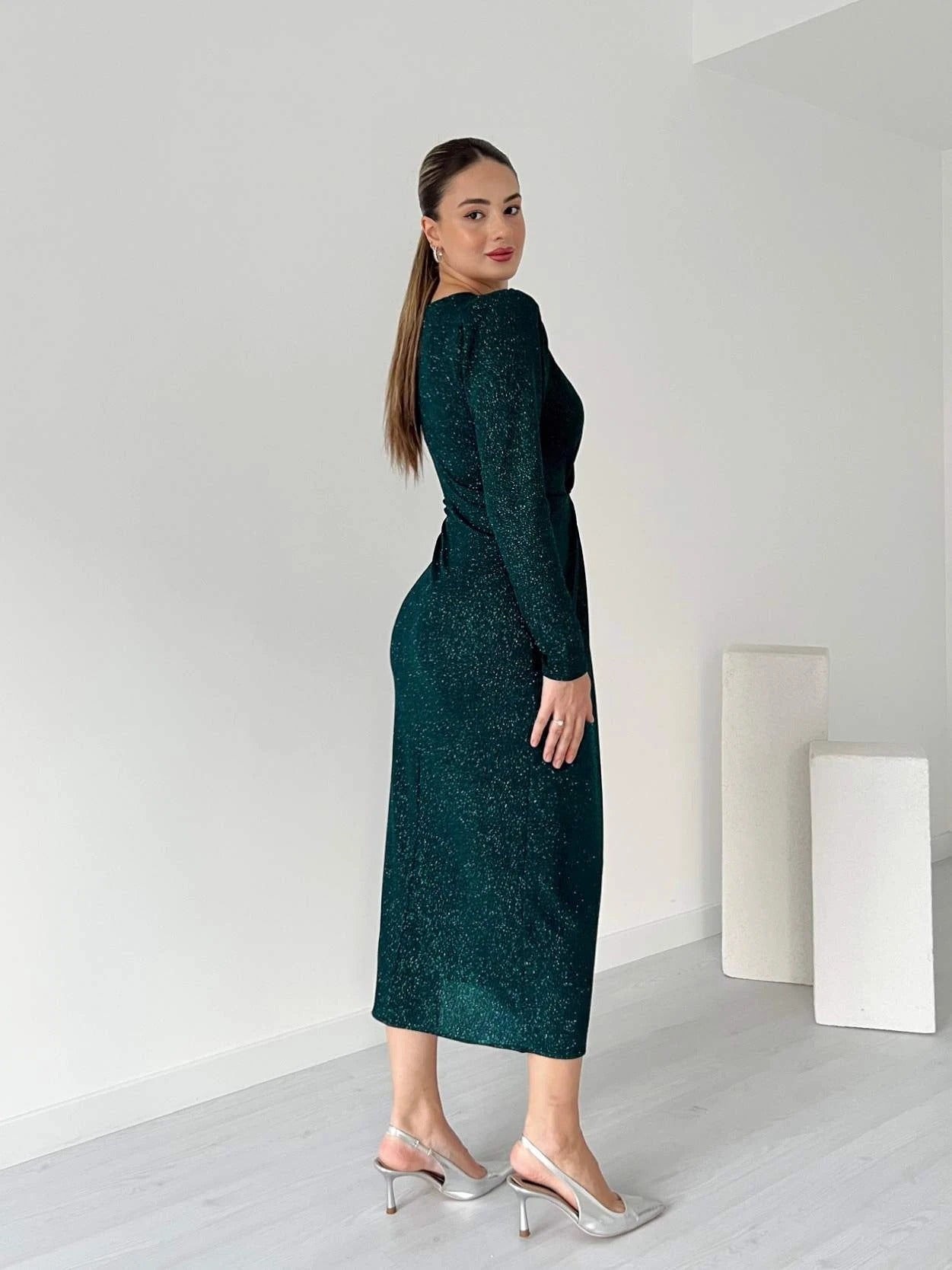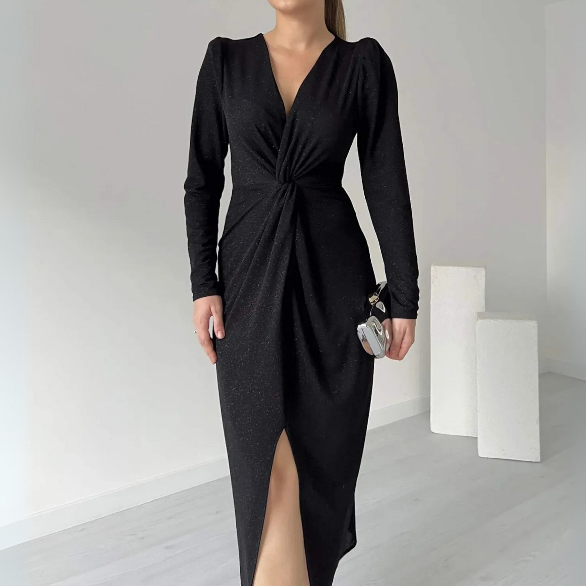 Features: Deep V-neck, long sleeves, twist-front detail at waist, side slit, bodycon midi silhouette