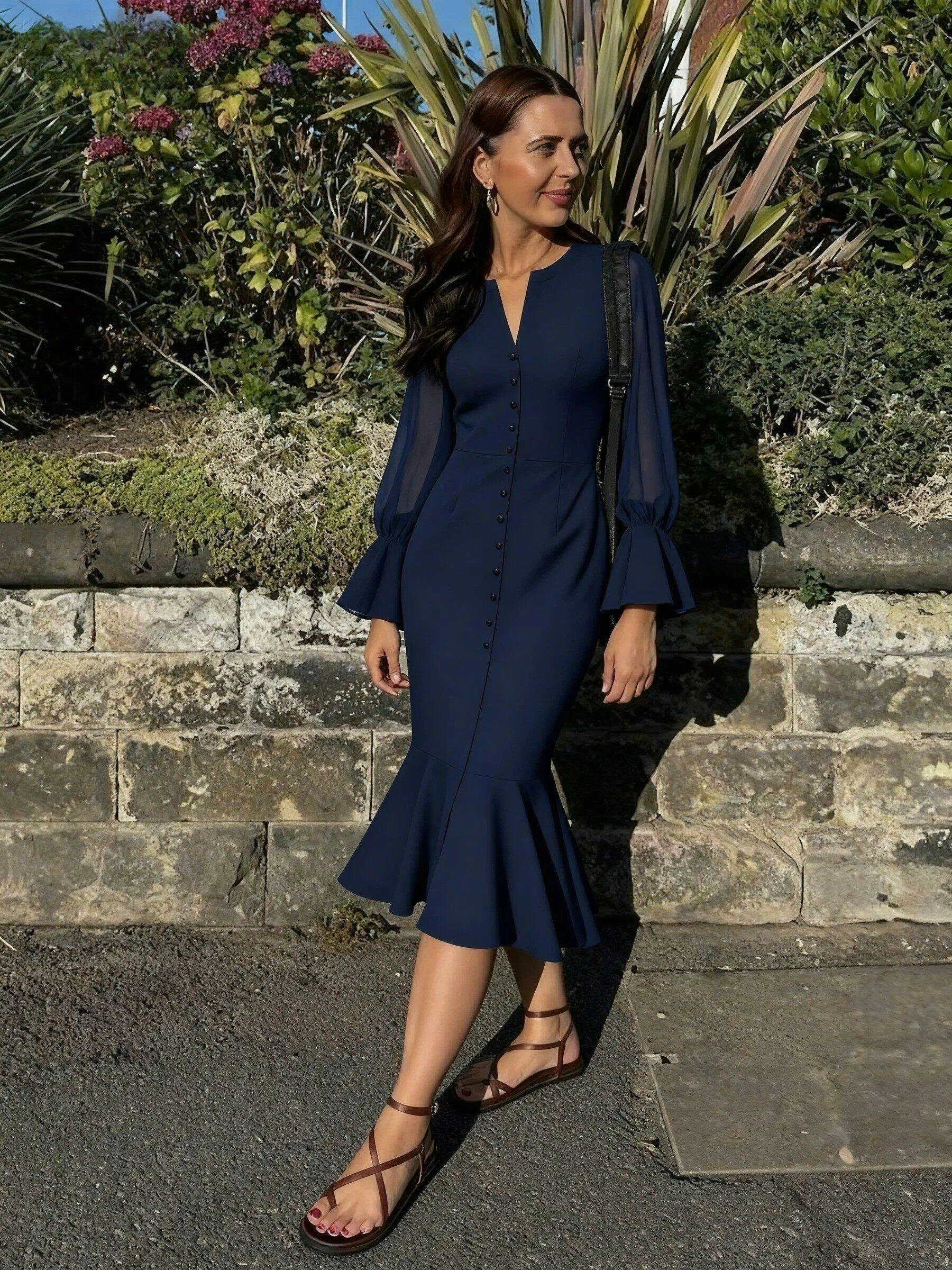 This navy dress is a game-changer! Wore it to a work conference—my boss said I looked 'polished AF'—then to a dinner party. The sheer sleeves feel fancy, and the mermaid hem makes it so chic. Got asked where I got it TWICE!