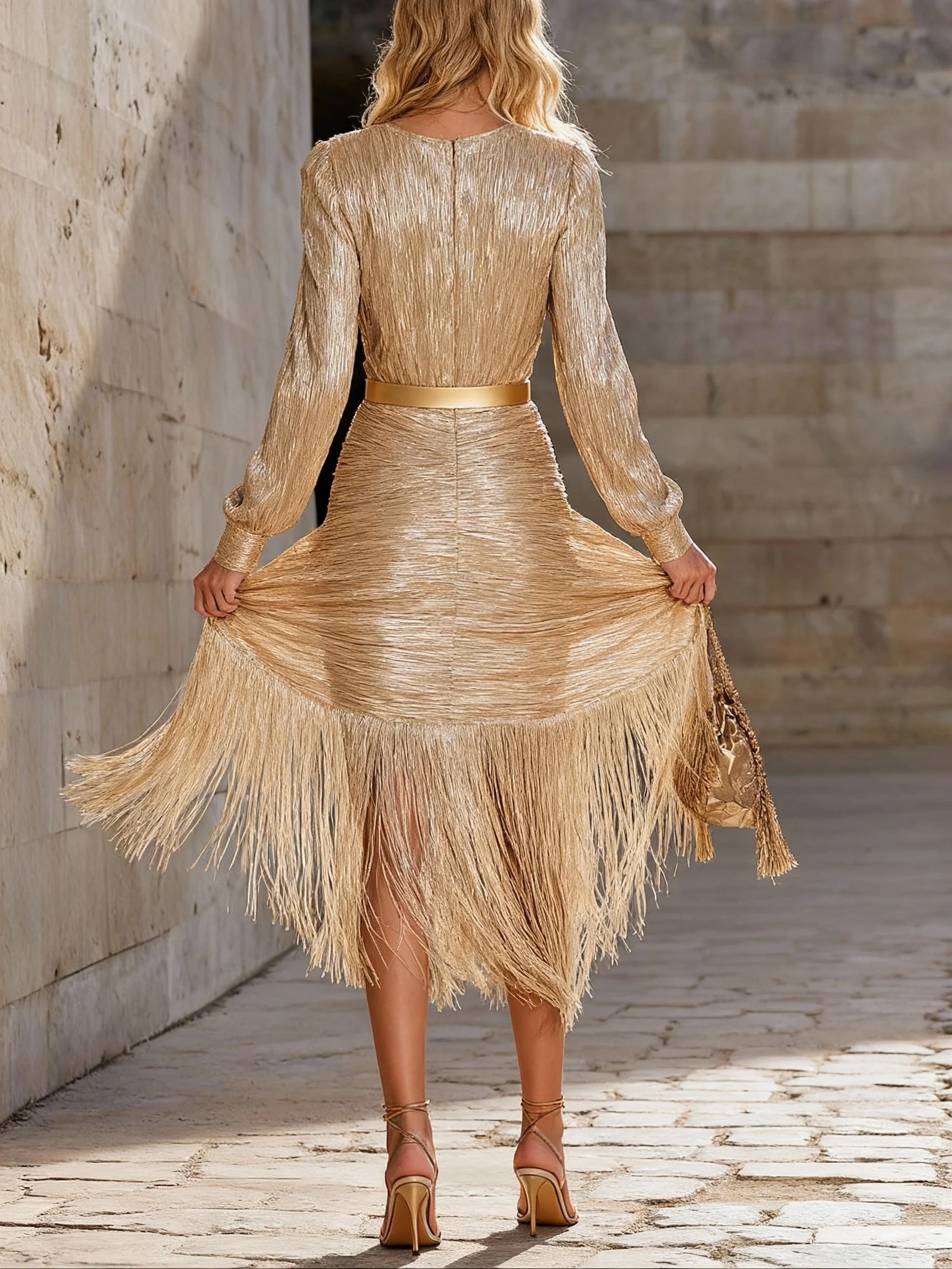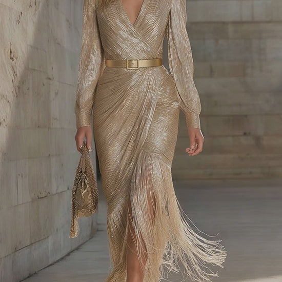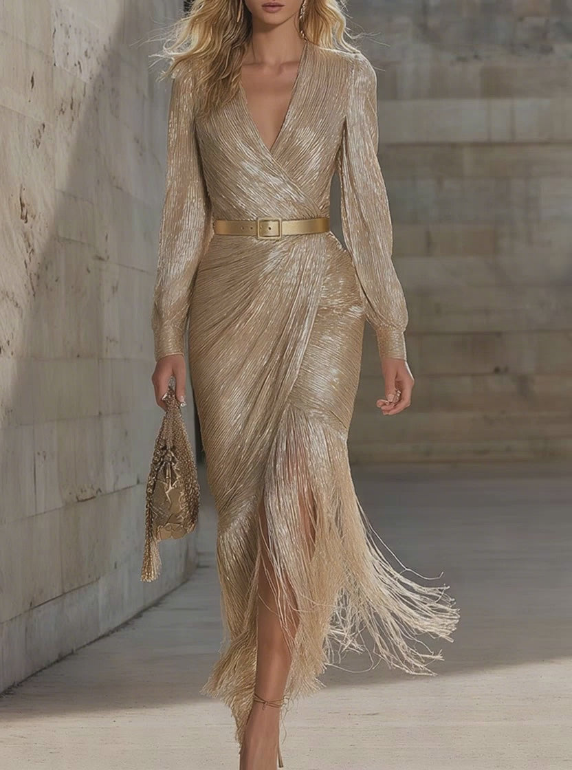 Chic And Sophisticated V-neck Tassel Champagne Shimmering Maxi Dress