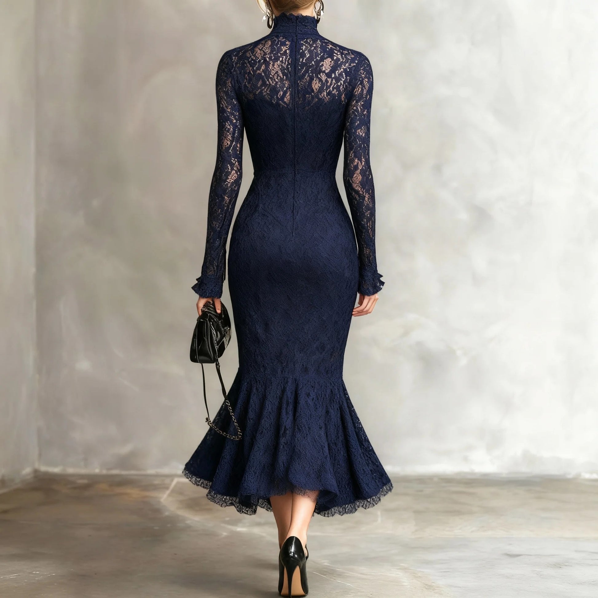 Elegant Party Navy Blue Stretch Lace Fishtail Maxi Dress