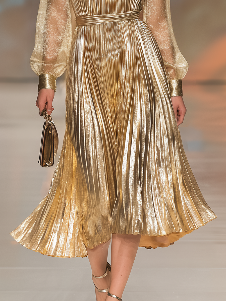 For styling, pair it with classic pumps or ankle‑strap heels to maintain an elegant line. A slim belt can define the waist and subtly highlight the pleats. Add a structured handbag and minimalist jewelry—such as pearl studs or a delicate chain—for a balanced, graceful look. For layering, a cropped blazer or light wrap complements the dress’s flow. Ideal for office settings, luncheons, or evening gatherings, this piece blends simplicity with sophistication for effortless, timeless style.