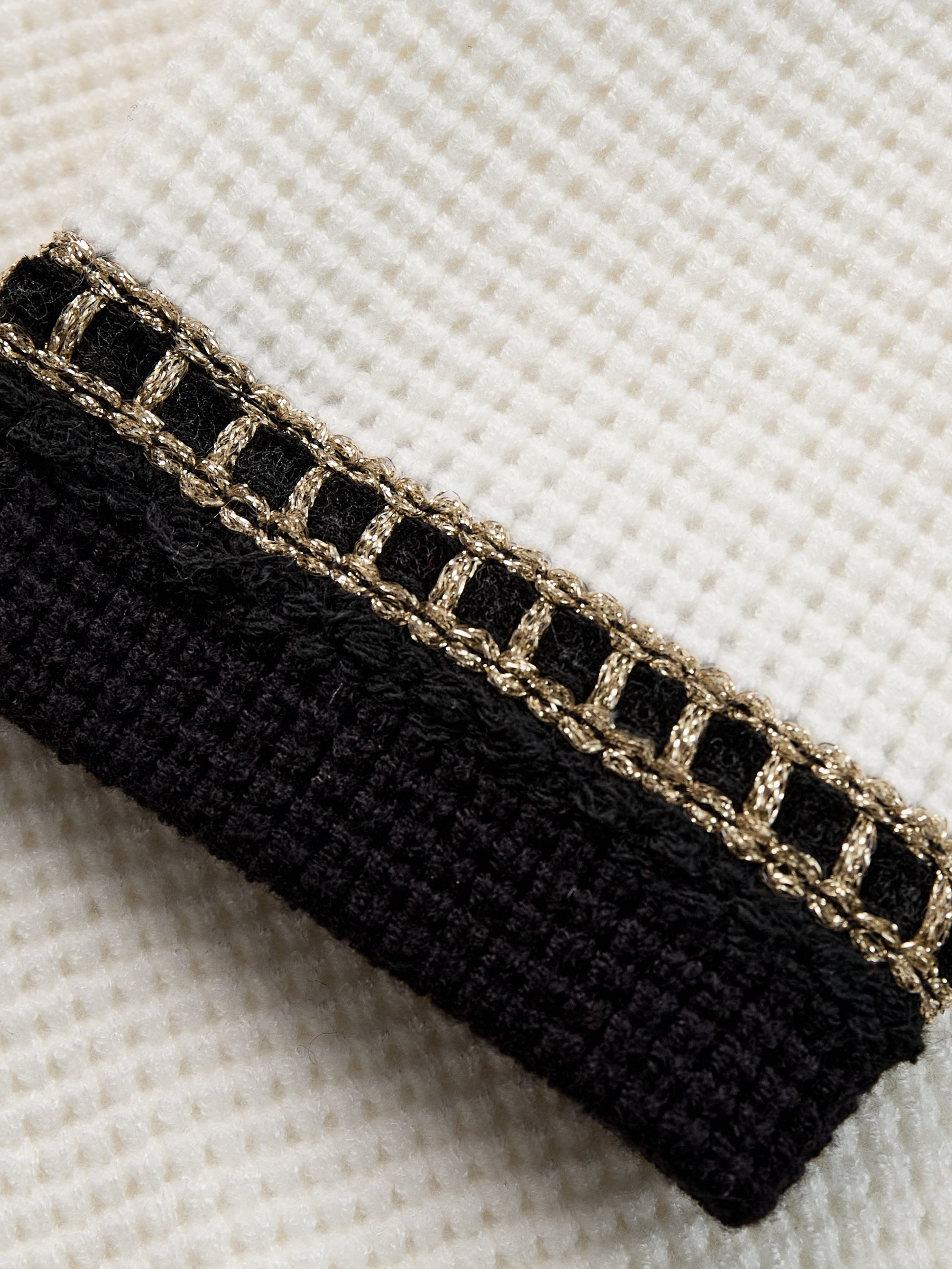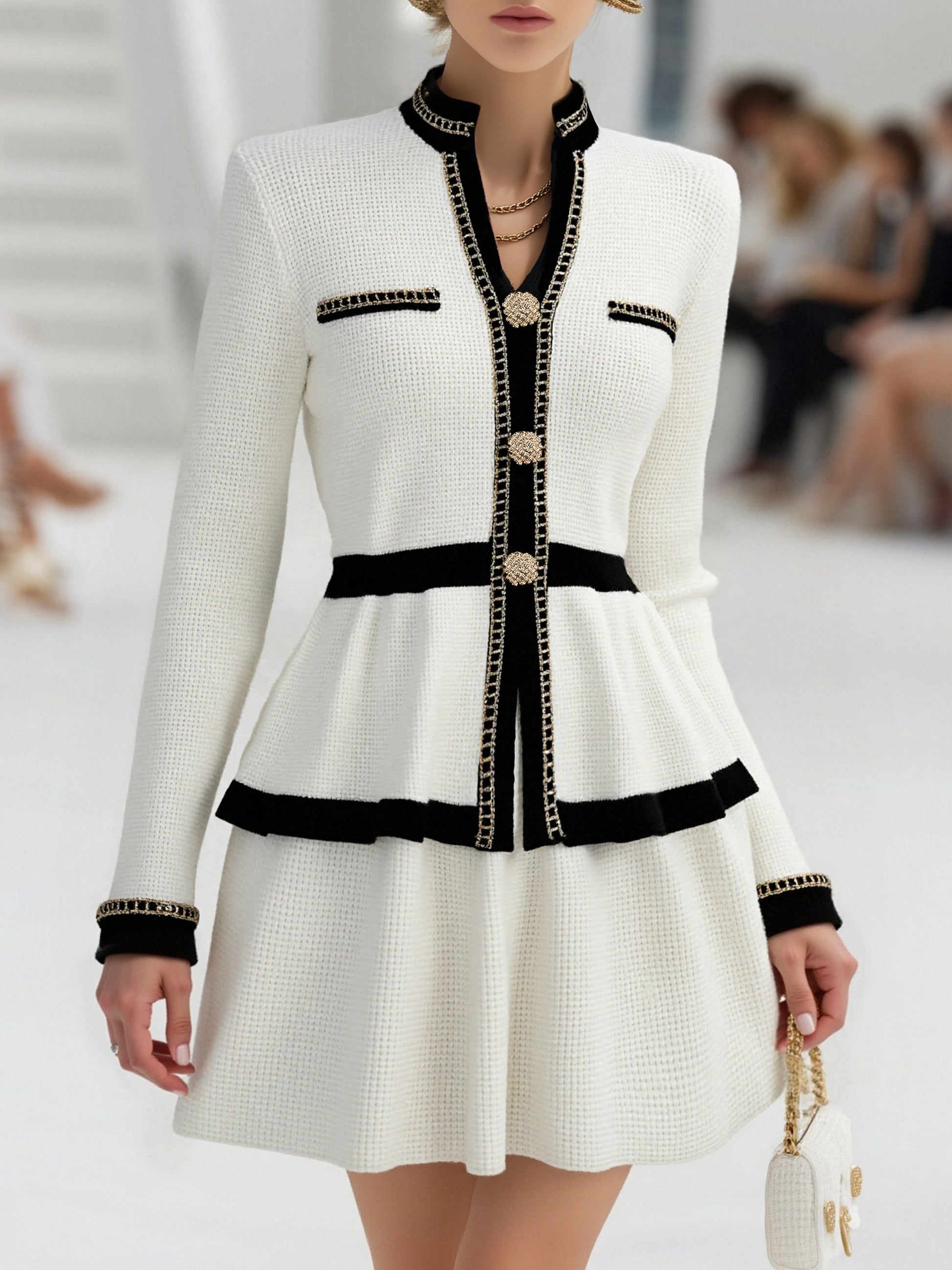 2.Design:Stand collar, long sleeves, decorative trim, pleated skirt