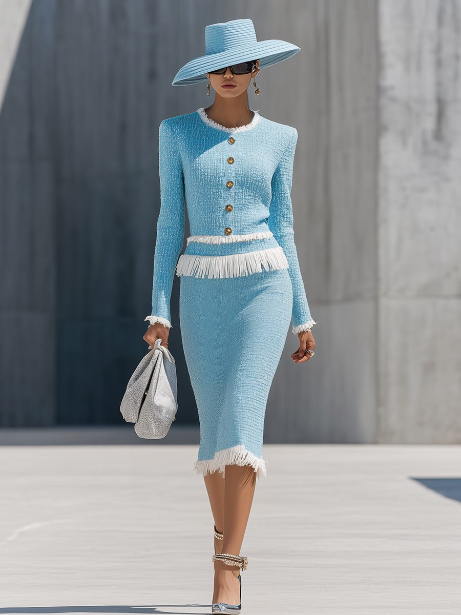An Elegant Vintage Gold Button Tassel Tweed Top and Skirt Set is the epitome of timeless sophistication with a touch of old-world glamour. Crafted from classic textured tweed, the top often features a structured or boxy silhouette enhanced with ornate gold buttons, reminiscent of vintage European couture. Delicate tassel detailing—typically trimming the sleeves, pockets, or hem—adds a playful yet refined element. The round or V-neckline, coupled with neatly tailored shoulders and front closures, elevates the ensemble with a polished finish.