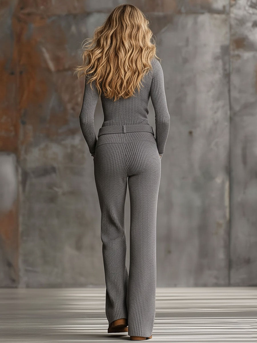 Fashionable Retro Gray Knit Half-zip Wide-leg Pants Set