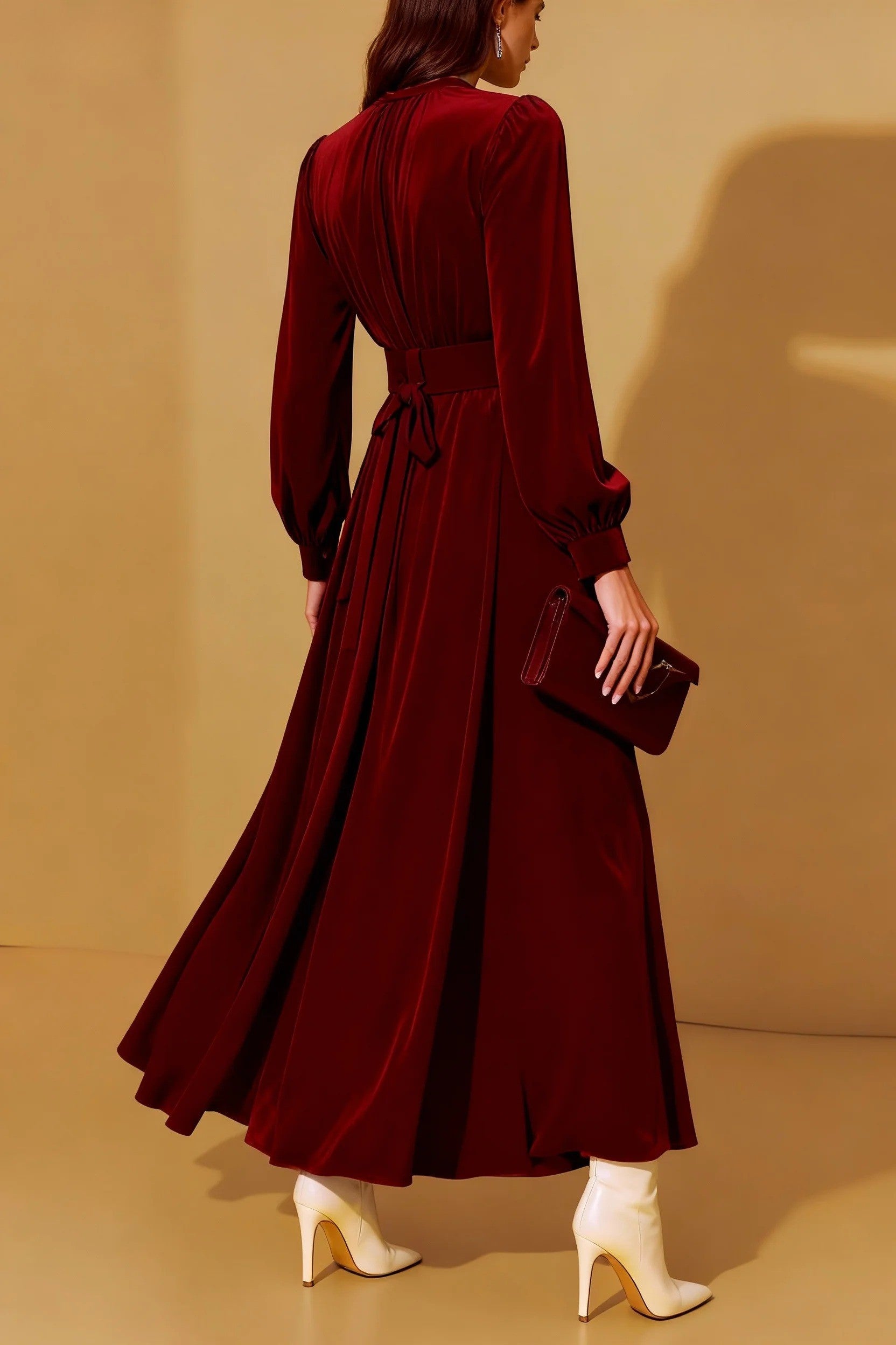 Formal Dress Burgundy V-Neck Long Sleeve Velvet Maxi Dress