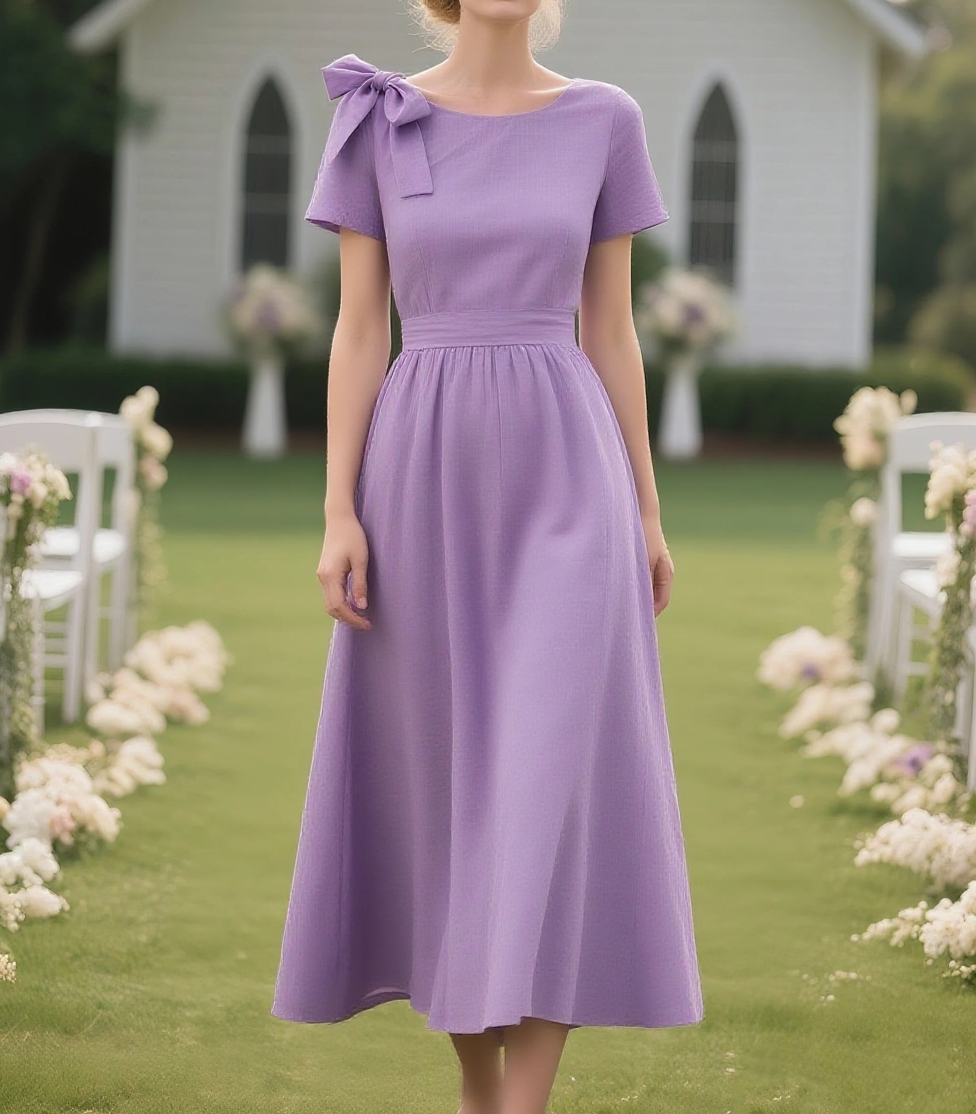 Features:Short sleeves, round neckline, large bow detail on one shoulder, elastic waistband, and a high - low skirt with a side slit.