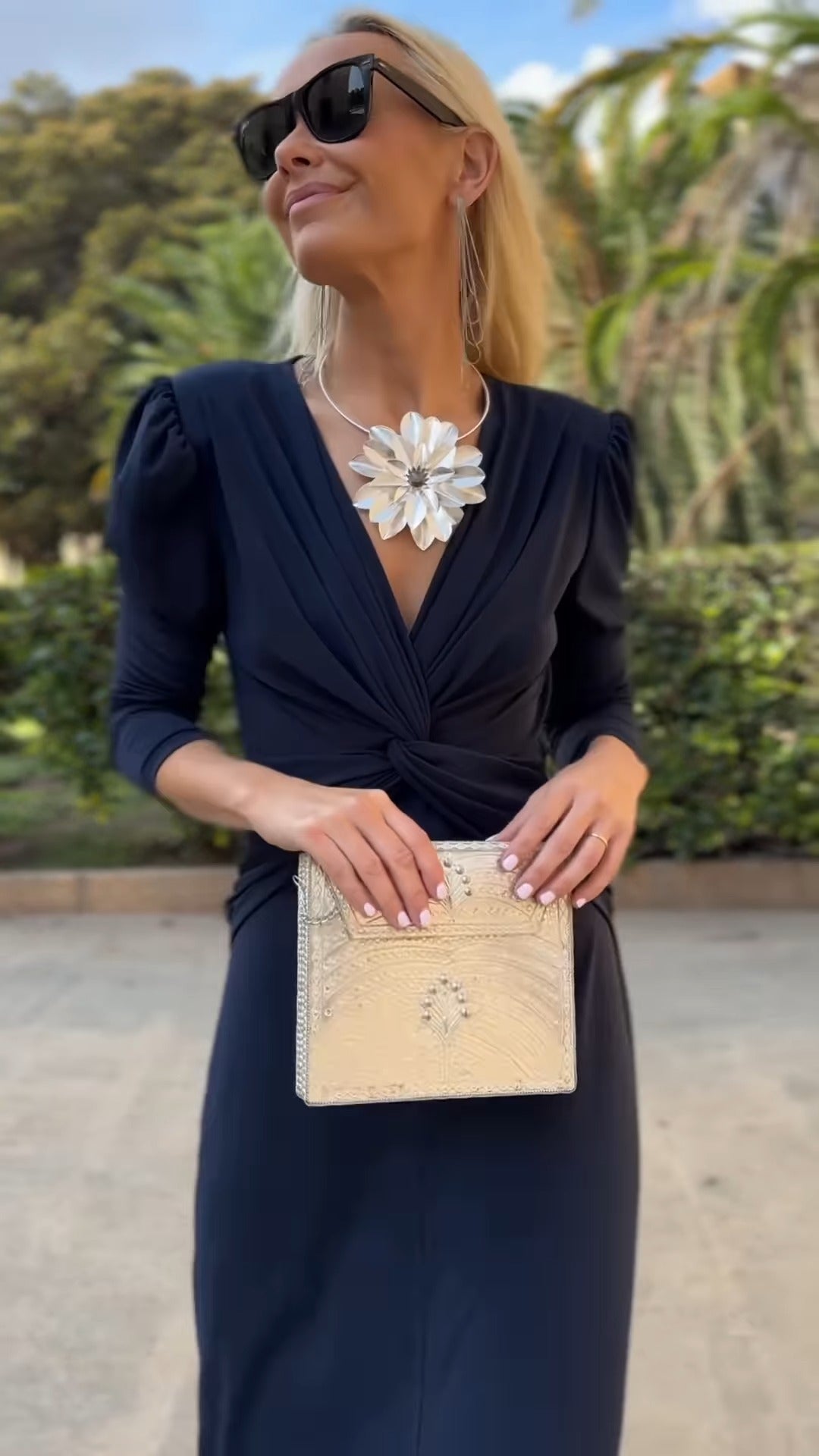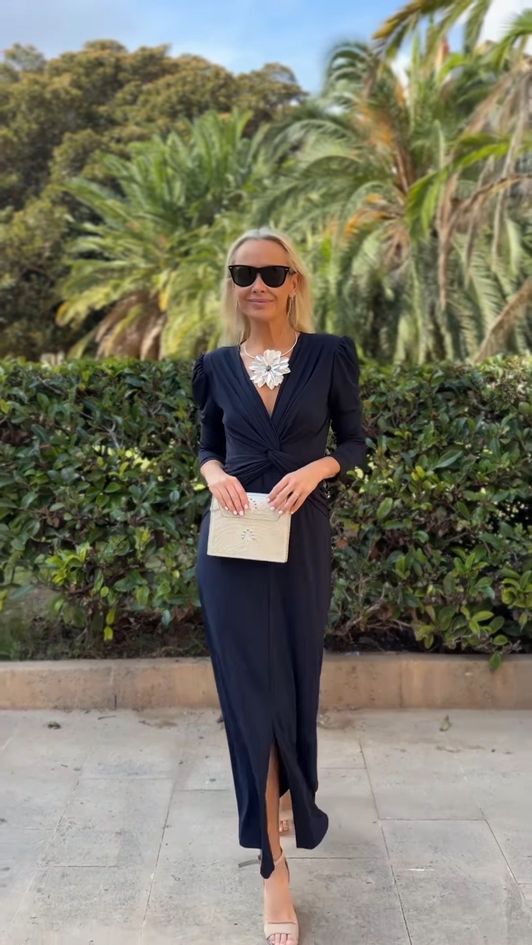 Styling is polished: pair with a light-colored embossed clutch (like the one shown) and nude strappy heels. Add a statement floral necklace to complement the dress’s elegant tone. Available in XS to 3XL, it’s a chic choice for embracing versatile formal-casual styling.