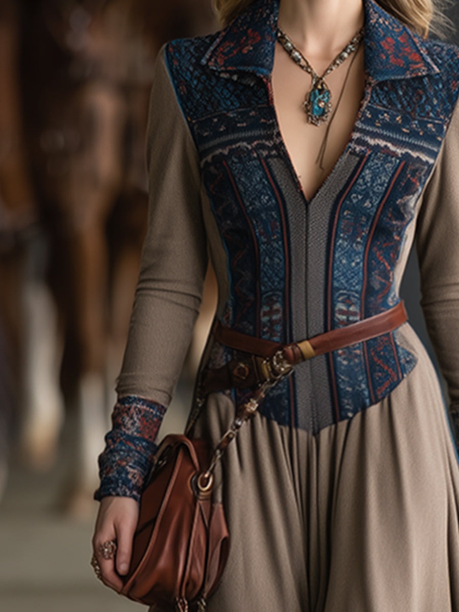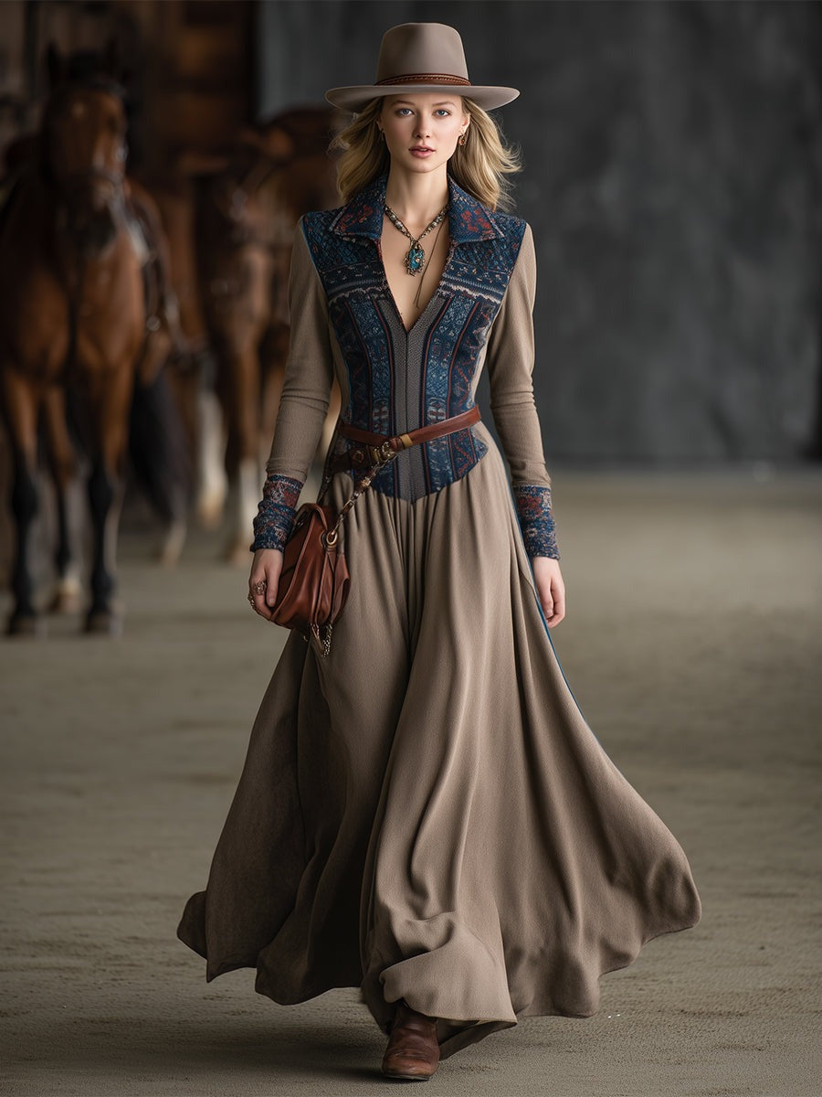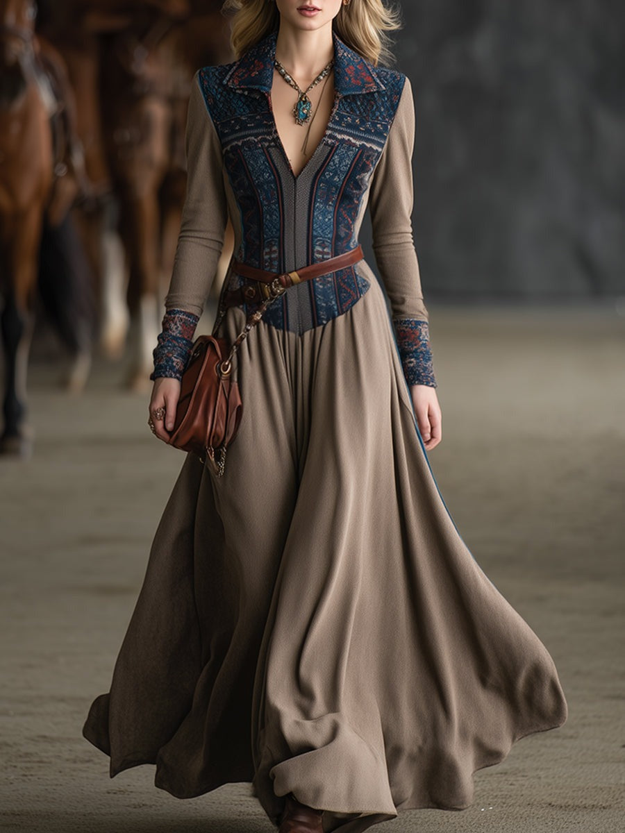 Retro Bohemian Collar Color-Blocked Print Khaki Maxi Dress