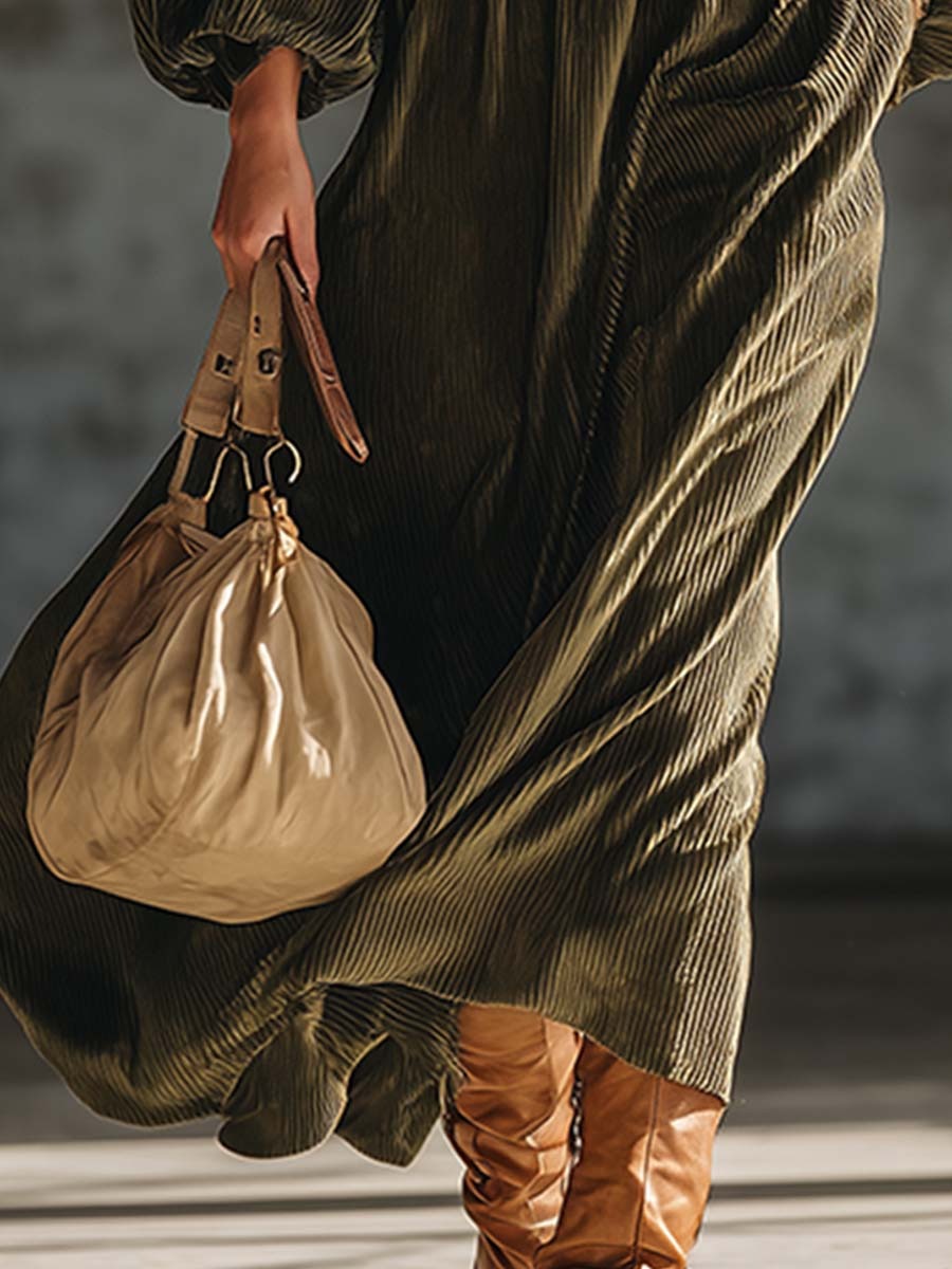 Retro Exquisite Army Green Textured Velvet Loose Maxi Dress