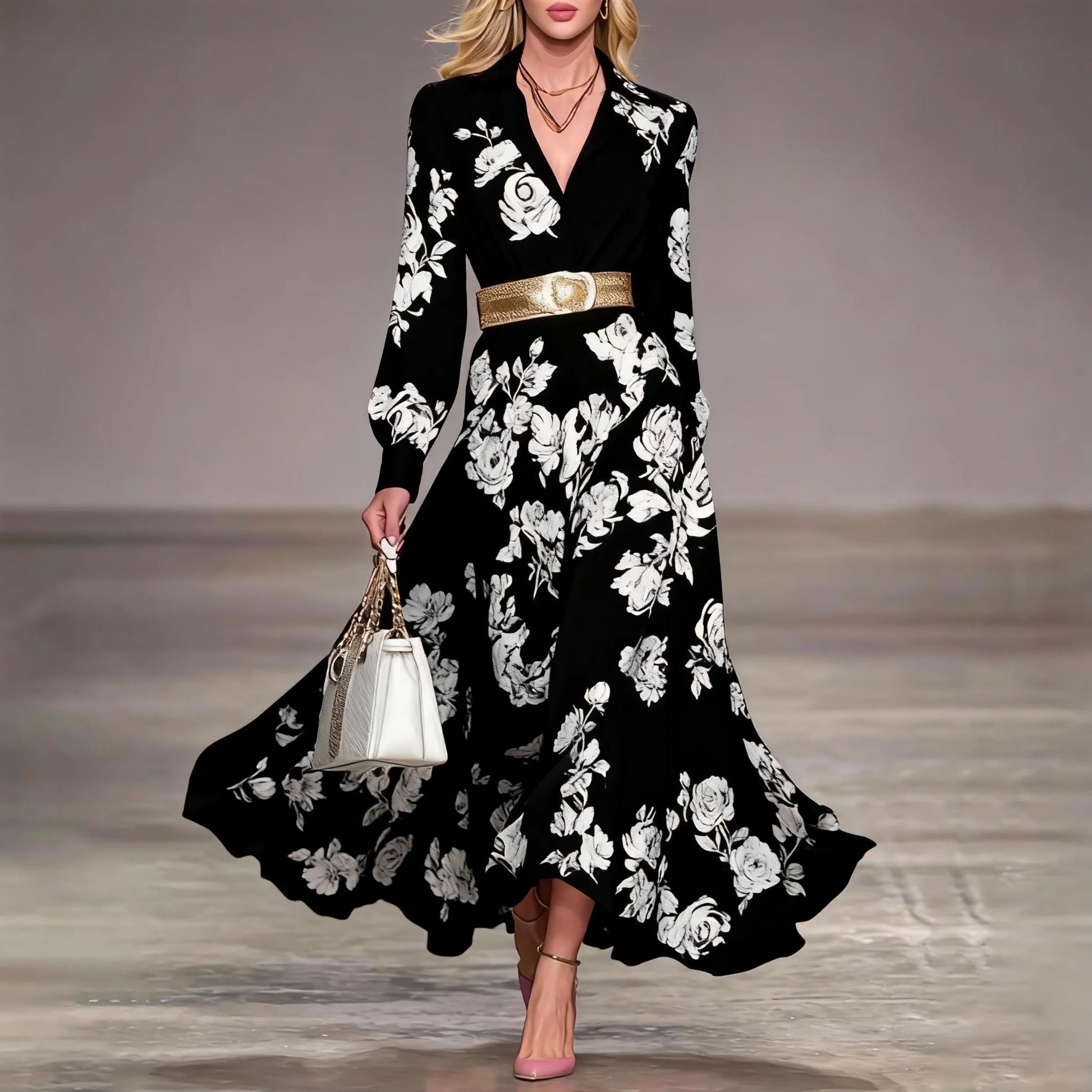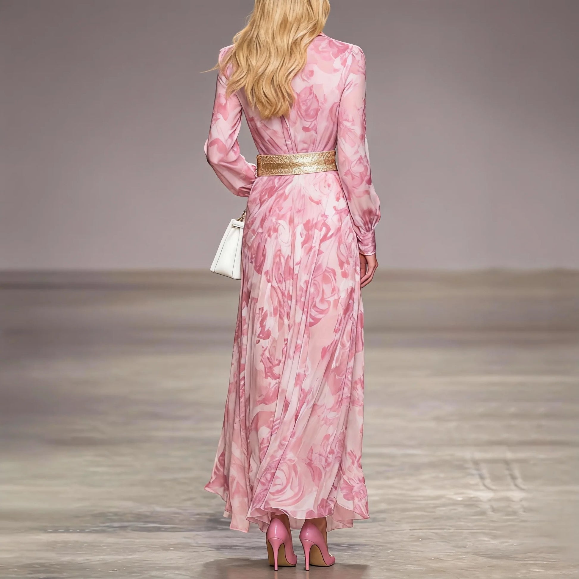 Elevate your wardrobe with this sophisticated maxi dress, featuring an elegant collar neckline and romantic pink floral print throughout. The flowing silhouette offers graceful movement and timeless appeal, making it an ideal choice for special occasions, garden parties, or refined everyday wear. Crafted with attention to detail, this piece combines classic design elements with contemporary styling. The full-length cut provides modest coverage while maintaining a flattering drape. Perfect for those seeking a versatile dress that transitions seamlessly from day to evening events.