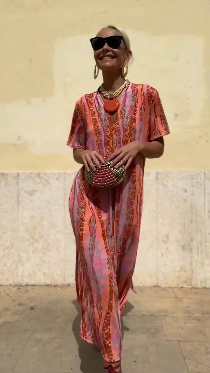 - Features: V-neck, short sleeves, relaxed fit, midi length