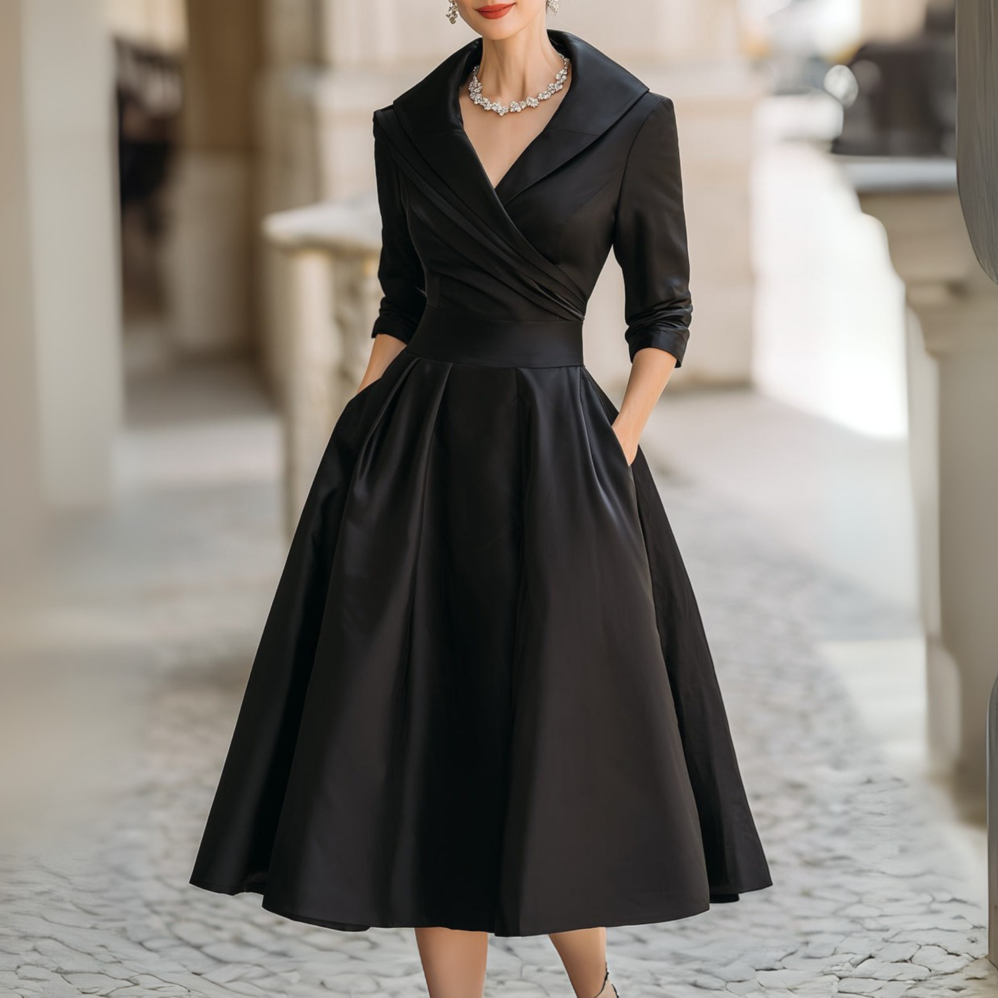 The elegant satin wrap midi dress blends timeless sophistication with modern comfort. Crafted from lustrous satin, it features a chic shawl collar, a wrap-style bodice with draped detailing that flatters the figure, 3/4 sleeves for refined coverage, and a high-waisted A-line midi skirt with convenient side pockets. The flowing skirt ensures graceful movement, while the tailored bodice accentuates curves. Perfect for formal dinners, evening galas, or wedding guest looks, it exudes classic glamour.