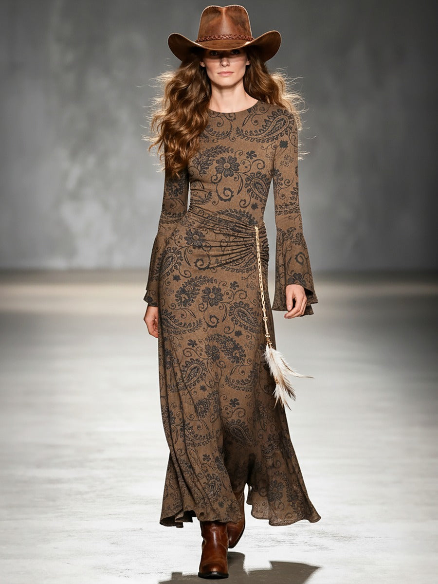 Vintage Western-inspired Paisley Print Faux Suede Maxi Dress