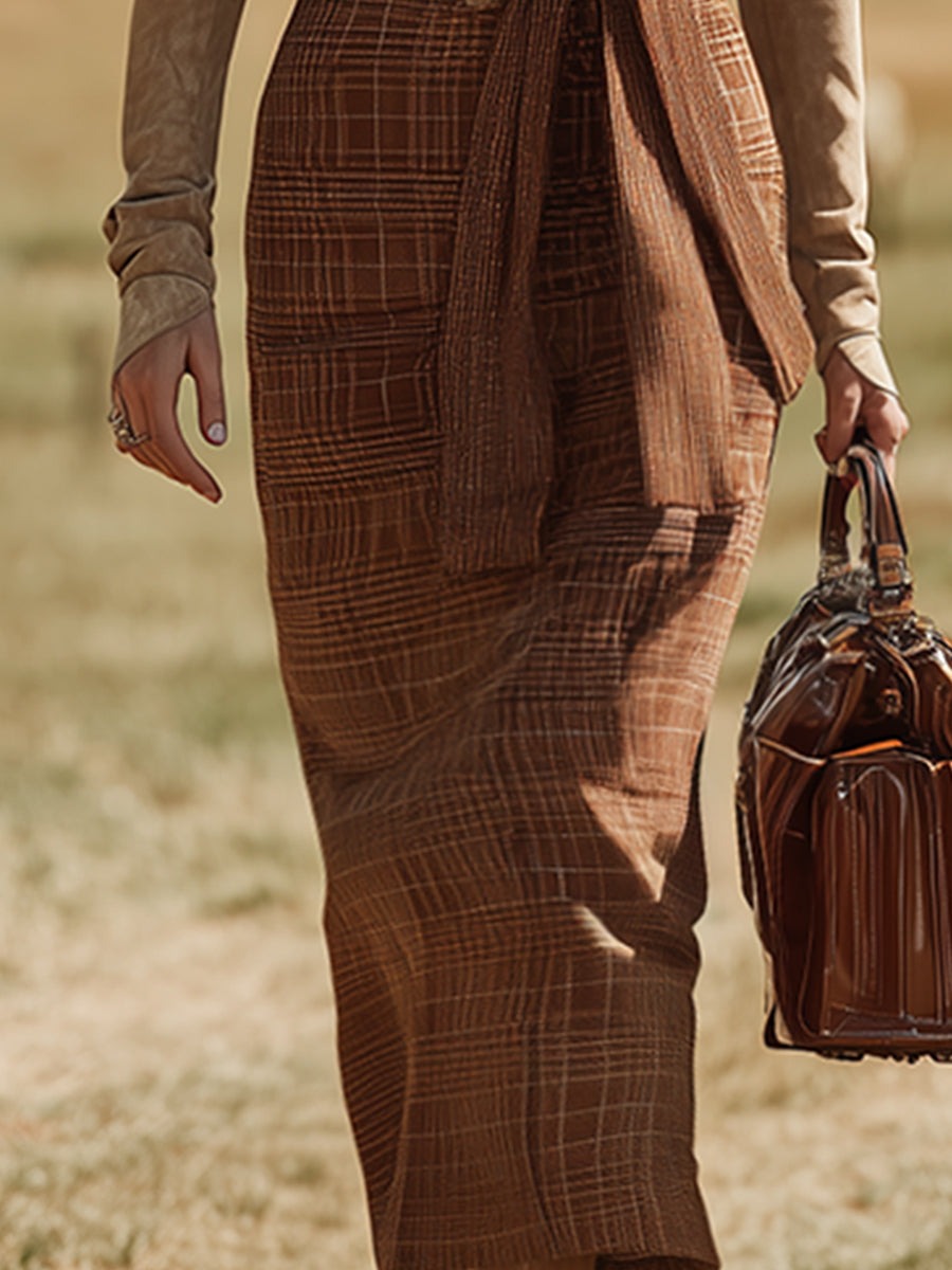 This Vintage Western Khaki Faux Suede Plaid V-Neck Maxi Dress is the perfect choice for those seeking a blend of vintage elegance and modern fashion. The comfortable fabric and slim fit make it a versatile addition to any wardrobe, perfect for everything from casual get-togethers to formal occasions.
